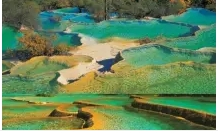 进入黄龙景区,首先看到的是一组精巧别致、水质明丽的池群--【迎宾池】。池子大小不一,形状奇特, 色彩艳丽,错落有致,四周山岳环峙,林木葱茏,山间野花竞放,彩蝶飞舞。山间石径曲折盘旋, 点缀着观景亭阁,倍添情趣。